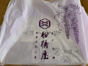 開けると、船橋屋のきれいな藤色の袋が登場。