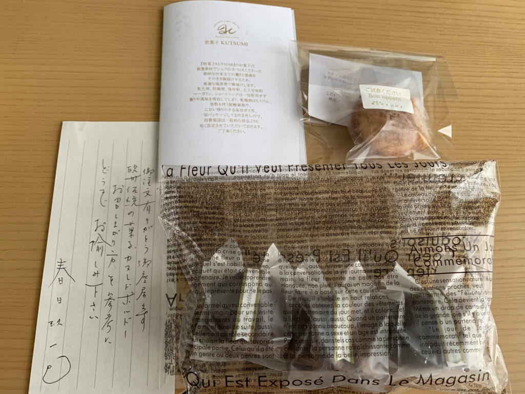 注文したのはカヌレのみですが、2,000円以上購入すると期間限定でもらえる試食品のマドレーヌも入っていました。