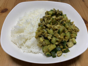 きゅうりの存在感が異様で、おいしそうには見えないかもしれませんが、きゅうりを使った料理の中で夫が一番好きだと言っていたのがこちらのドライカレー。