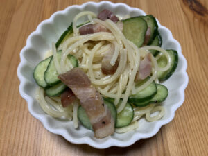パスタ、ベーコン、きゅうりをボールに入れて混ぜ、マヨネーズと塩こしょうで味つけをしたら、完成!