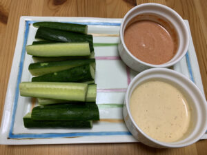 切ったきゅうりにディップソースを添えだけで簡単にできるのに、食卓が少し華やかになる野菜スティック。