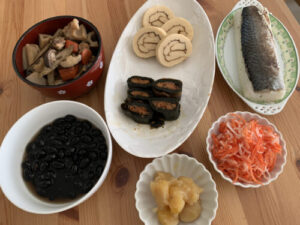 私がつくったのは中央上の「伊達巻」、右下の「紅白なます」、左上「筑前煮」です。