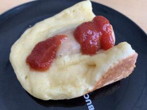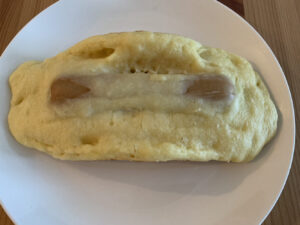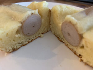 ここが少し難しくて、写真のようにフランクフルトの上に生地がのっかってしまったり、固定できずすぐにはがれてしまったりします。