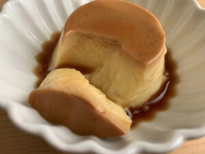 お皿に出すと、写真のように一部は崩れてしまいますが、カラメルソースと一緒に食べられるのがうれしいです。