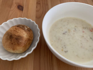 パンのもっちりしたところにクラムチャウダーが染み込んで、食べると外側のカリっとした食感を同時に楽しめました。