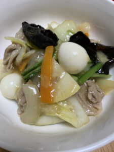 最後に、うずらの卵と調味料を入れたら、別で用意した水溶き片栗粉でとろみをつけて完成〜!