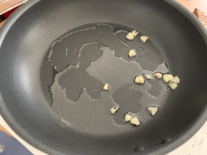 フライパンに油をひき、薄切りにしたにんにくに弱火で火を通します。
