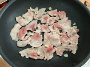 香りがたってきたら、食べやすい大きさに切った豚肉を炒めます。