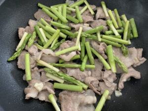 肉の色が変わったら、切っておいたアスパラを入れて一緒に炒めます。