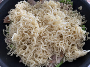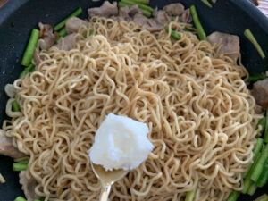 どちらも目分量なのですが、しょうゆはさーっと回しかけて麺の色がまんべんなくうっすら変わるくらい。