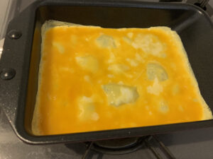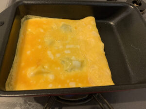 玉子を流し入れて、端っこを一度折りたたみました。