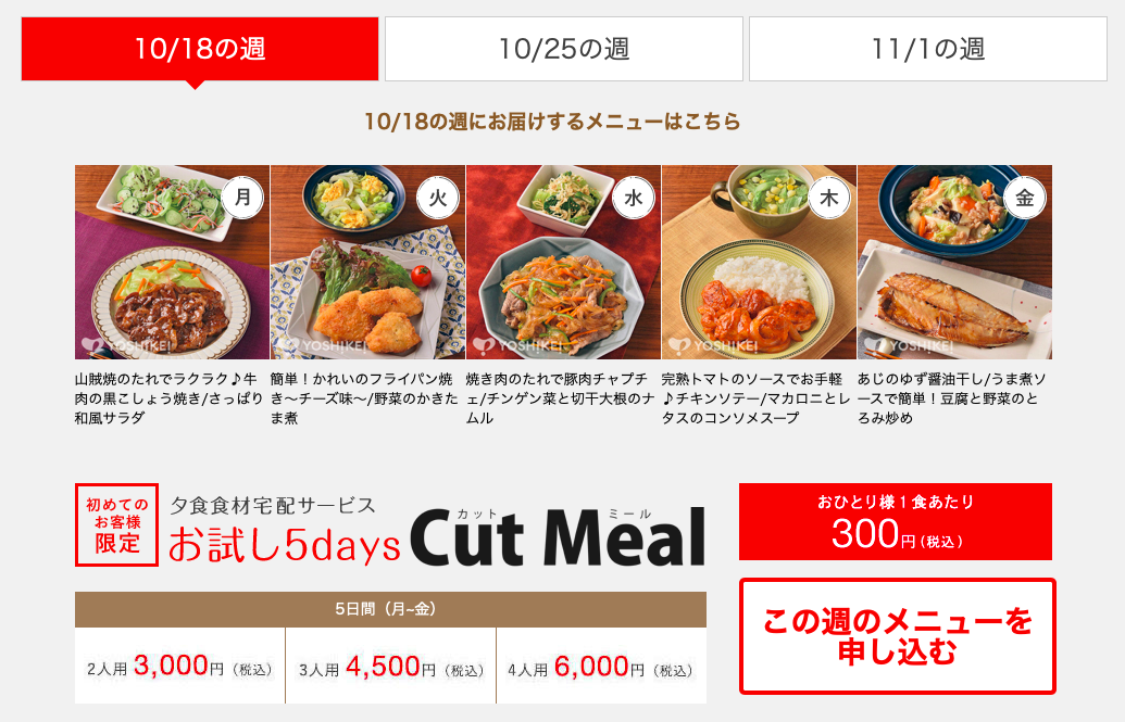 ヨシケイのお試しは、月曜から金曜までの5日間、通常価格の半額ほどで注文できるサービスです。